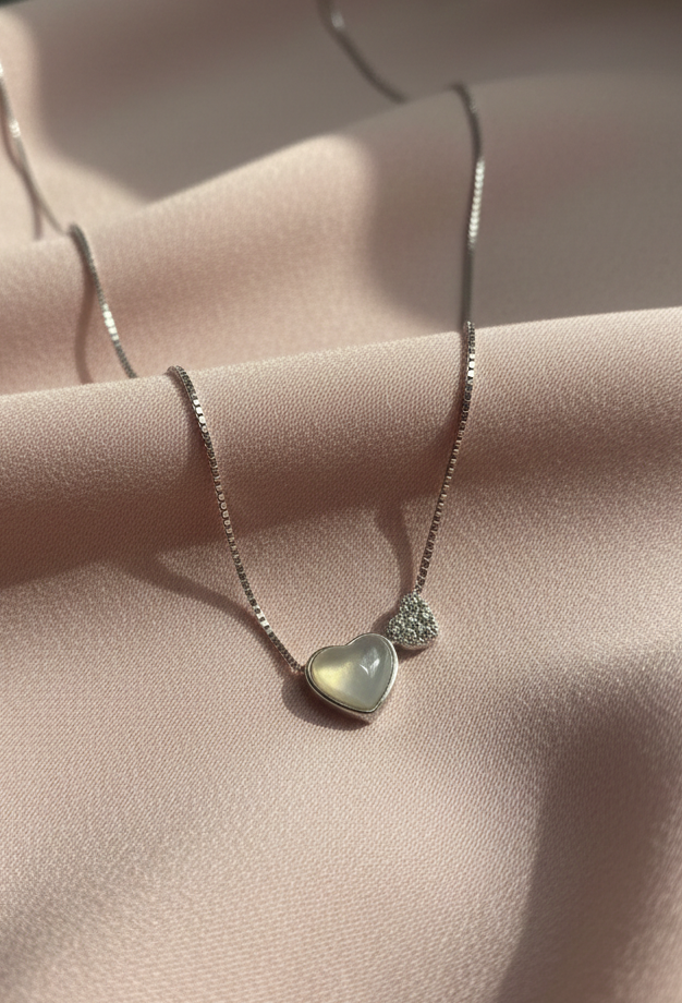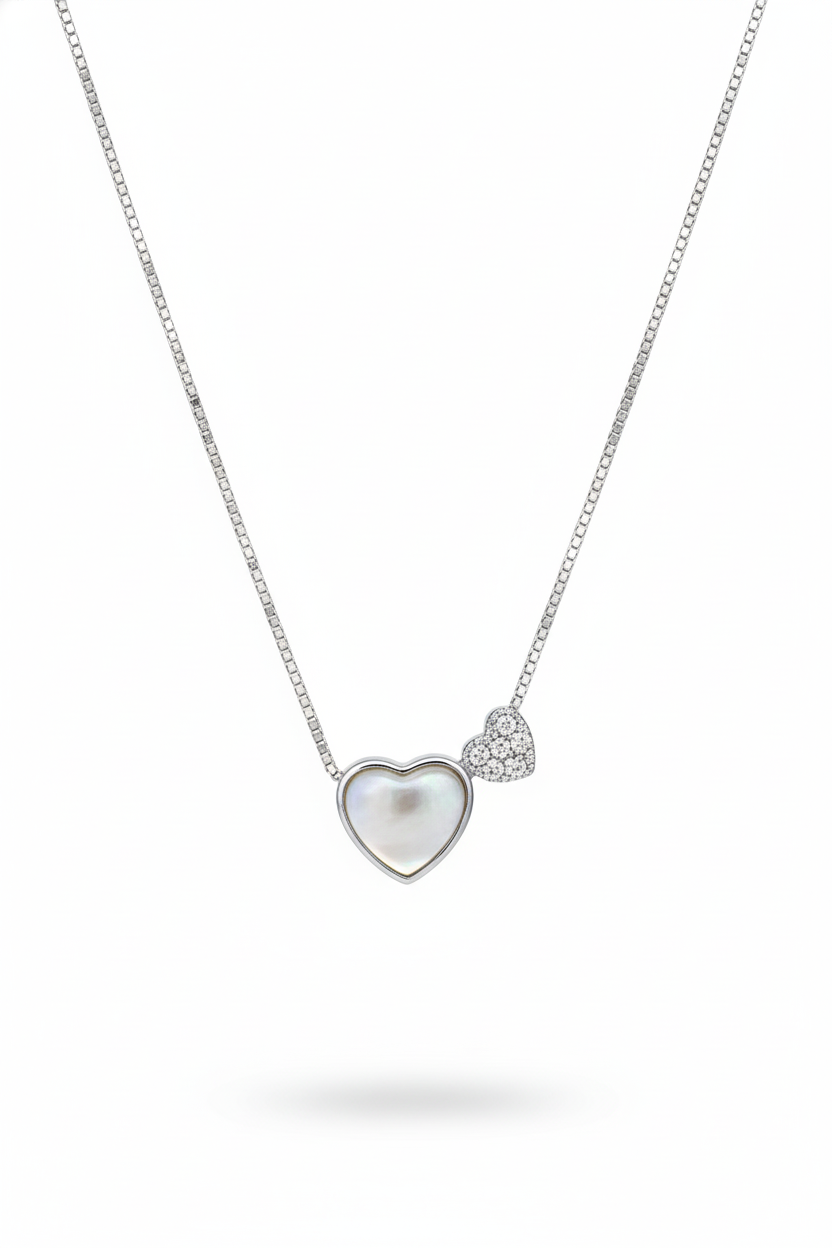 Celebrate love with our Double Heart Silver Necklace. This adorable design features two hearts nestled together: a smooth, lustrous White Shell Heart (Mother of Pearl) representing purity, and a tiny Diamond-Studded Heart adding a touch of sparkle.