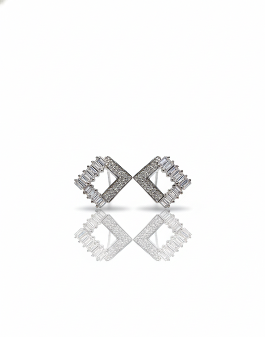 Geometry Meets Glamour Upgrade your jewellery collection with these architectural masterpieces. These Geometric Open Square Studs are a perfect example of modern craftsmanship. The design features a unique "dual-cut" arrangement: sleek Baguette-cut crystals on one side for a mirror-like shine, and glittering Round-cut stones on the other for maximum sparkle.