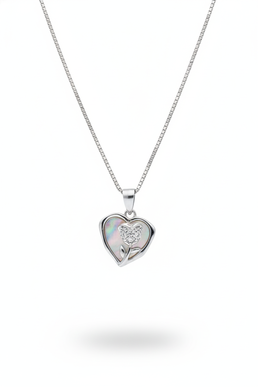 925 Sterling Silver Mother of Pearl Heart & Rose Necklace (Box Chain)